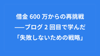 心の裏側ログ 借金600万からの再挑戦——ブログ2回目で学んだ「失敗しないための戦略」 1回目のブログで150記事書いて収益74円。挫折を経て再挑戦する副業ブログ2回目は「努力+仕組み」で違いを出す挑戦記録です。 2025.09.06 心の裏側ログ